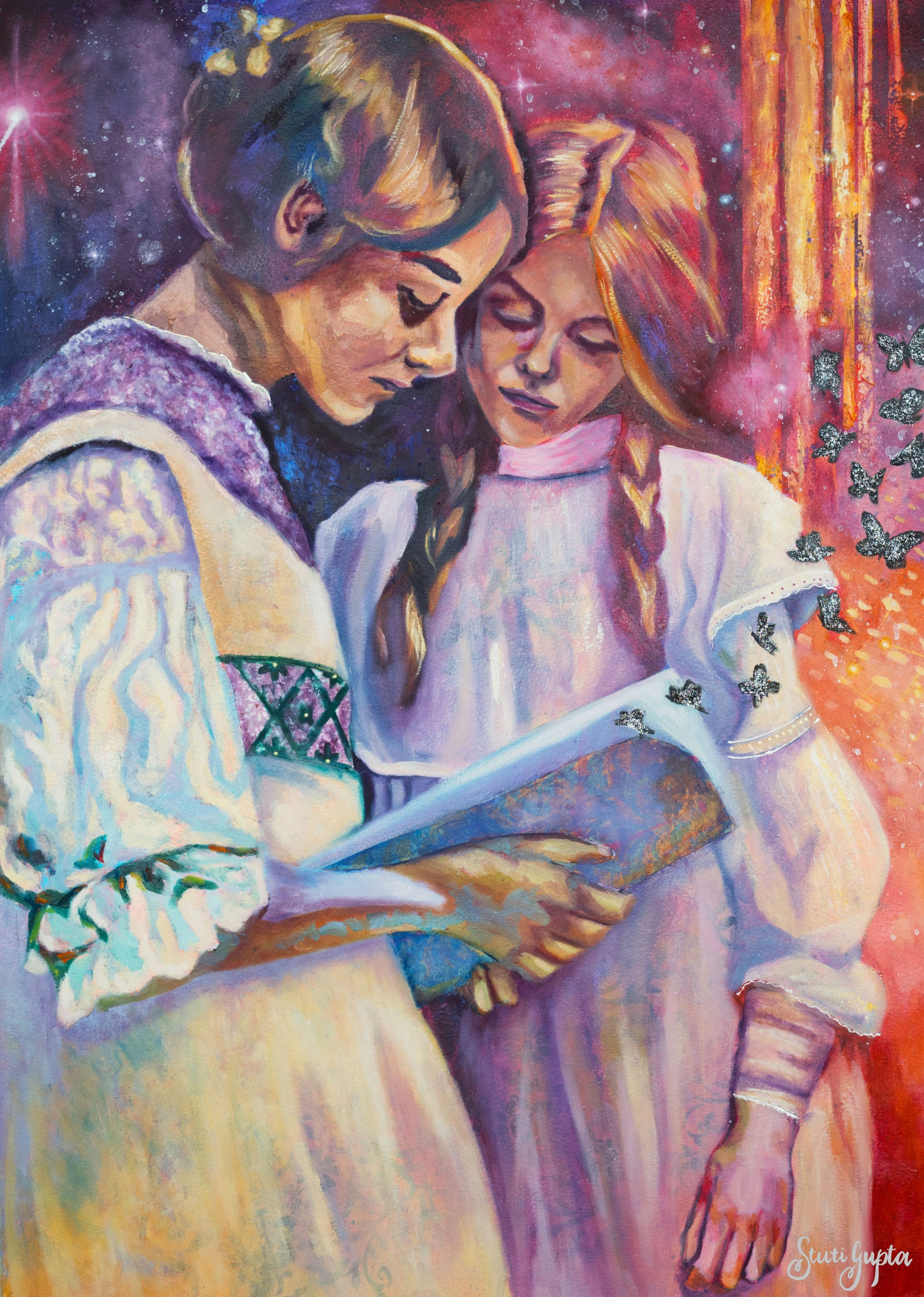 Two young minds, bathed in cosmic hues, unfurl their wings of knowledge. They transcend earthly bounds, propelling into realms of unimagined discovery with the power of knowledge.
