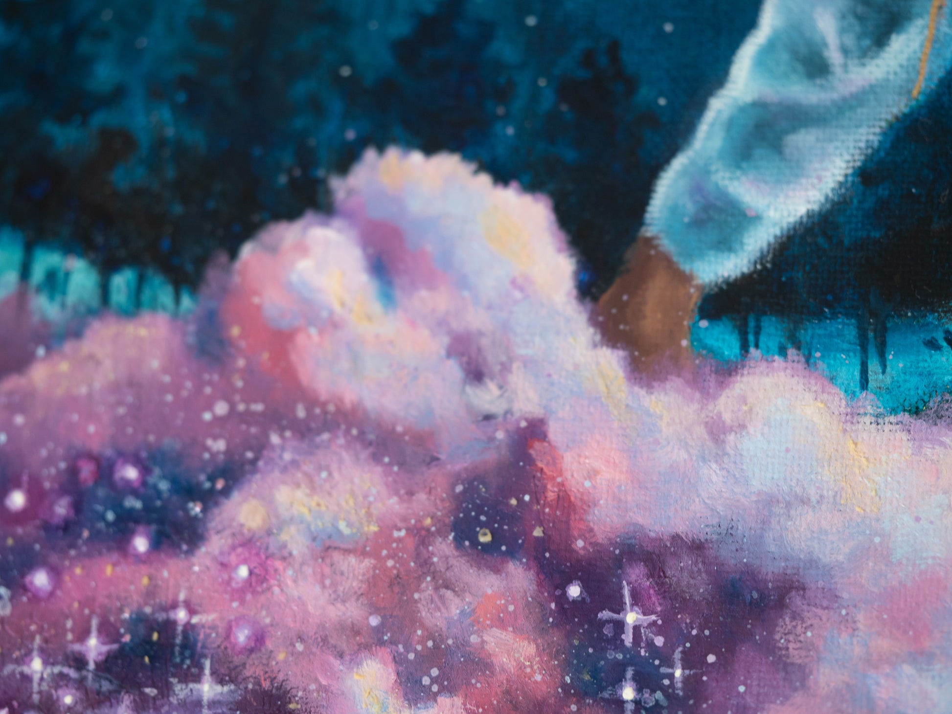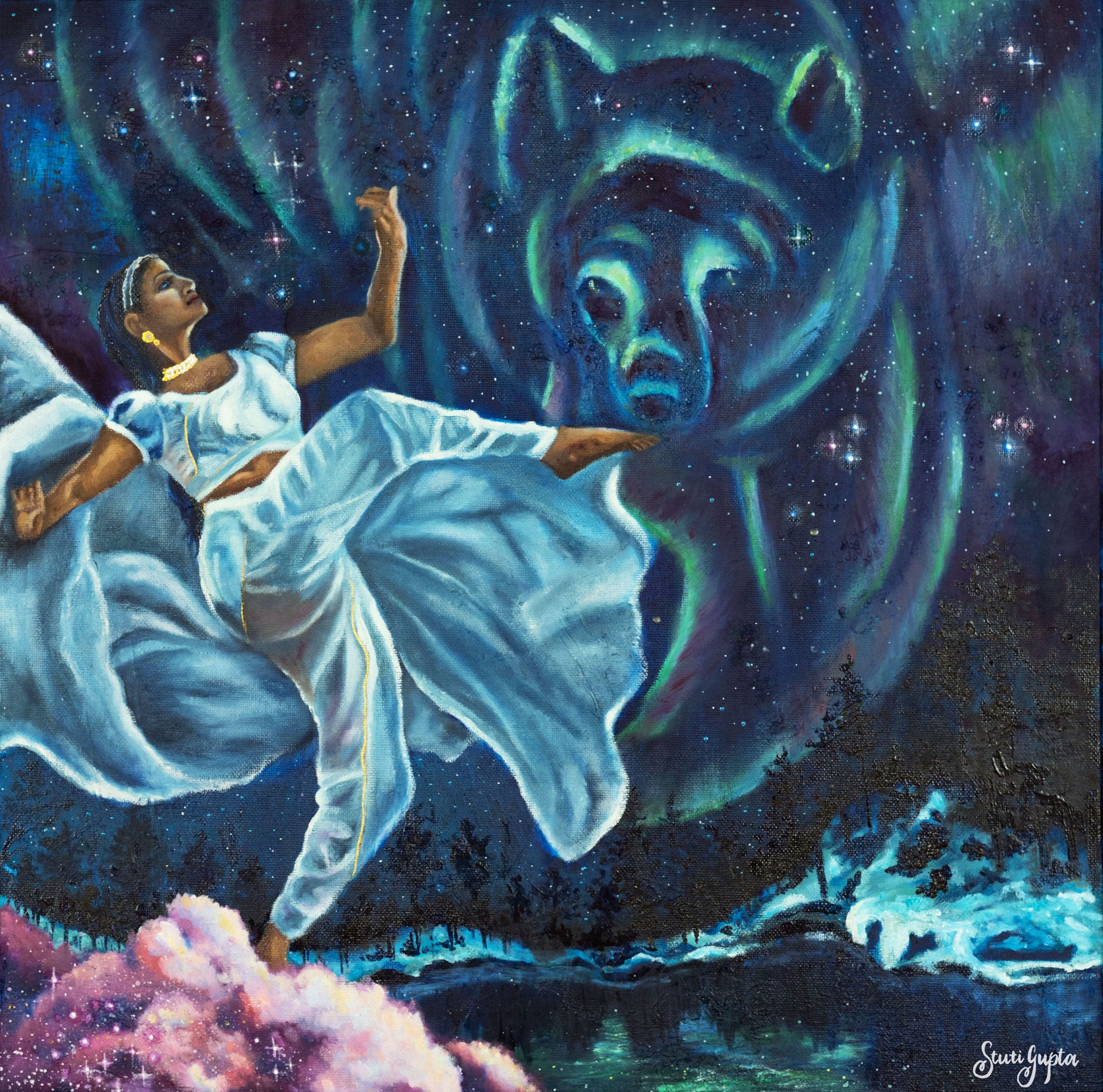 Her dance, a metaphor for humanity's rhythm, echoes across the fantastical panorama. Each twirl, a story woven into the cosmic tapestry, embodying the ethereal dance between traditional and otherworldliness.