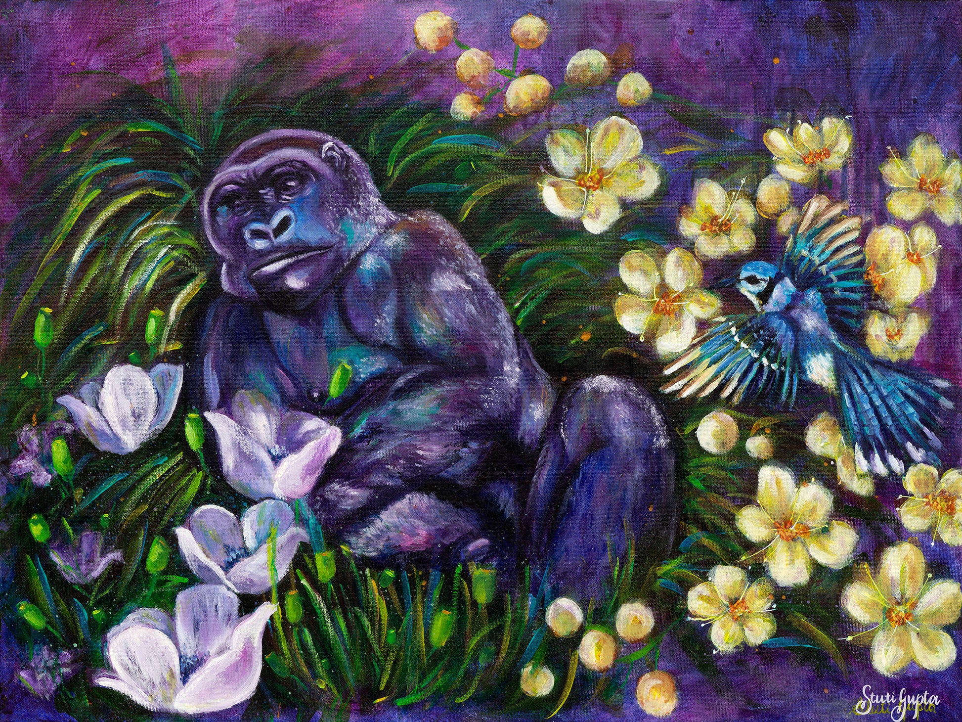 The meeting of the gorilla and the blue jay is a dance of harmony; A convergence of strength and aspiration, a symphony of unity.It symbolizes the balance between grounded presence and soaring dreams.A reminder that within stillness, hope and resilience gleams.